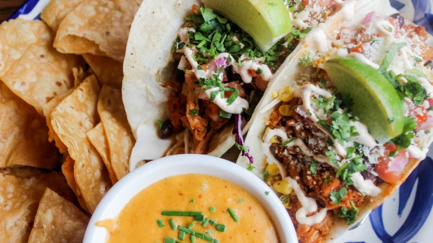 Two flour tortillas, pico de gallo, ranchero cream, charred corn & cotija cheese. Served with a side of queso & house made tortilla chips. Add a third for $4 +Ka boom Shrimp $2 +Grilled Shrimp $2 +BBQ Chicken +Seasoned Beef +Veggie