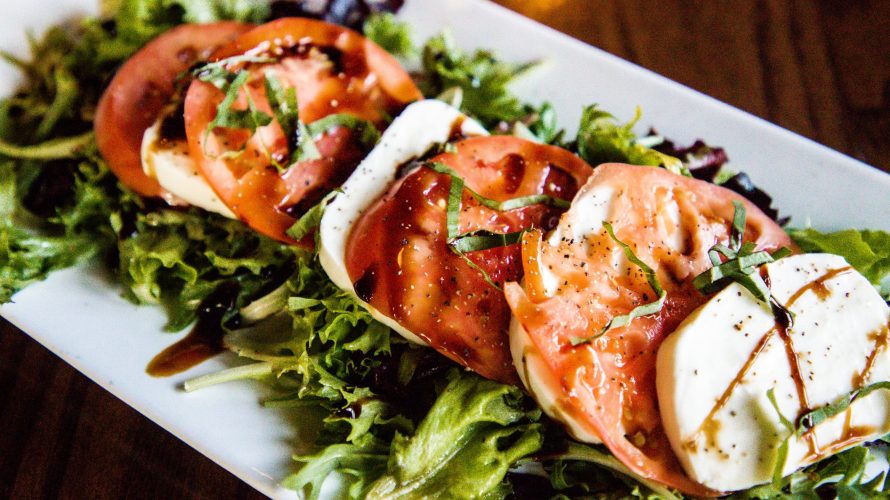 Thick sliced tomato, spring mix greens, mozzarella cheese, basil chiffonade, chive oil + balsamic glaze