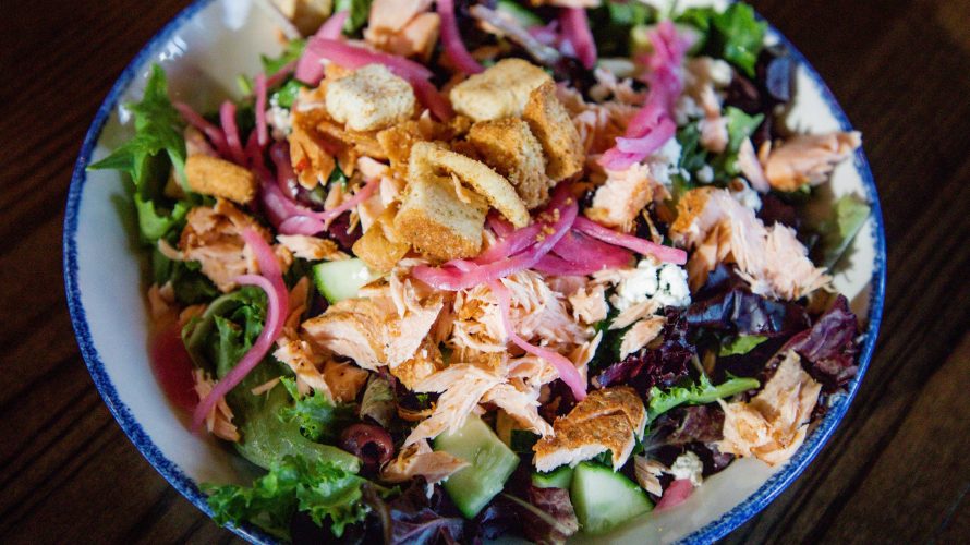 Spring mix greens, kalamata olives, shaved red onion, cucumbers, croutons, goat cheese, capers + house smoked salmon.