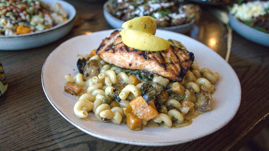 Eco-friendlygrilledNorwegiansalmon,wildrice, roasted butternut squash & brussel sprouts. Topped with garlic-rosemary lemon butter - [GFO]
