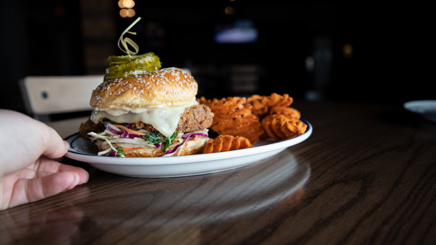 Blackened salmon sammy, remoulade, tomato, fennel kaleslaw- served on a sesame seed brioche bun.