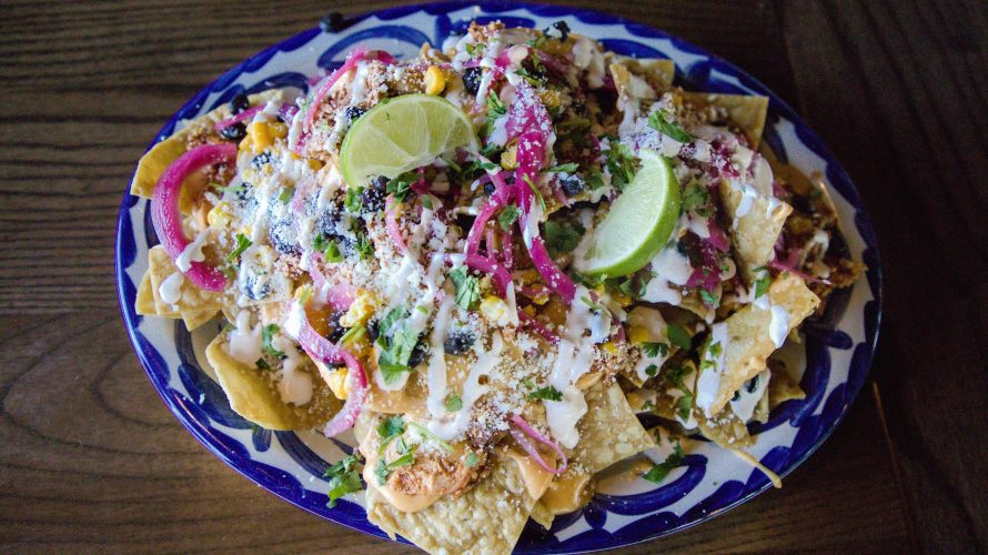 Roasted green chili queso, charred sweet corn, cilantro, pickled red onions, black beans & ranchero cream. Options of BBQ chicken, seasoned beef, or veggie.